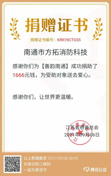 方拓消防堅持“依法組織、廣泛發(fā)動、堅持自愿、鼓勵奉獻”原則,公司領(lǐng)導干部帶頭捐贈,全體員工積極支持、踴躍參與,共同為南通慈善扶貧救助事業(yè)奉獻愛心。今后,方拓消防將充分發(fā)揮自身優(yōu)勢,繼續(xù)關(guān)心、支持慈善事業(yè),樹立公司良好的社會形象。
