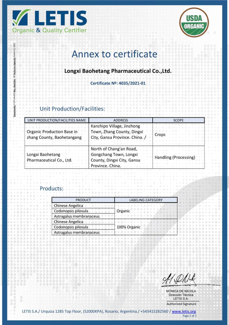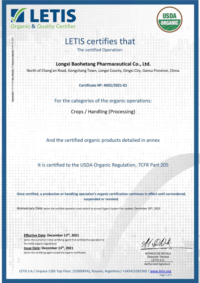 自2017年開(kāi)始,隴西保和堂在推動(dòng)道地有機(jī)種植基地建設(shè)、有機(jī)產(chǎn)品加工等方面不斷發(fā)力,先后于2019年12月獲得隴西、岷縣、漳縣、渭源、宕昌5個(gè)種植基地的《有機(jī)轉(zhuǎn)換認(rèn)證證書(shū)》,2020年12月獲得當(dāng)歸、黨參、黃芪的《有機(jī)產(chǎn)品認(rèn)證證書(shū)》,2021年7月獲得當(dāng)歸、黨參、黃芪生產(chǎn)加工《有機(jī)產(chǎn)品認(rèn)證證書(shū)》,并成功申請(qǐng)了產(chǎn)品有機(jī)標(biāo)簽。 公司從種子種苗繁育、土壤改良、種植基地建設(shè)、田間管理標(biāo)準(zhǔn)化、采挖加工等一系列環(huán)節(jié)入手,層層把關(guān),厲行標(biāo)準(zhǔn)化有機(jī)種植基地建設(shè)和車(chē)間加工建設(shè),實(shí)現(xiàn)了產(chǎn)品“來(lái)源可知,去向可追,過(guò)程可控,責(zé)任可究”,真正走出了一條產(chǎn)業(yè)優(yōu)、質(zhì)量高、可持續(xù)的發(fā)展新路子。此次美國(guó)NOP認(rèn)證證書(shū)的取得,為公司進(jìn)一步走向國(guó)際市場(chǎng)打下了堅(jiān)定的基礎(chǔ)。我們堅(jiān)信隨著公司產(chǎn)品品質(zhì)和知名度的不斷提升,“隴西保和堂”品牌產(chǎn)品會(huì)受到越來(lái)越多客戶(hù)的推崇和信賴(lài)。